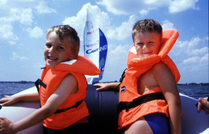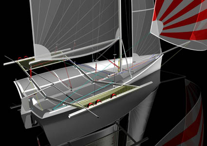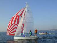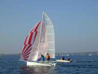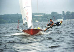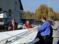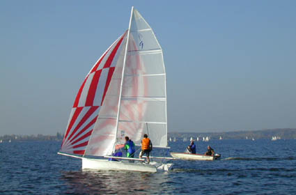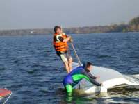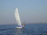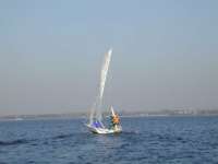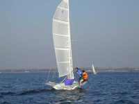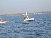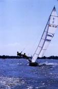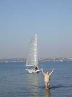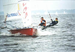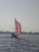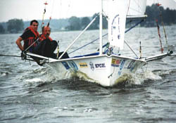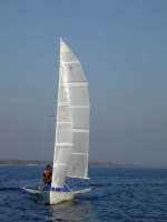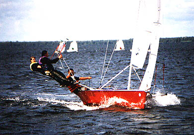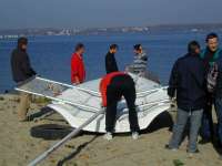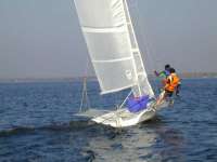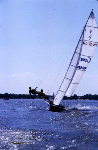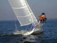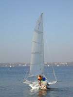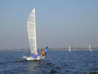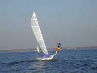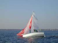 ![]() ![]() Konstrukcję jachtu wybudowano z laminatu p/s jako monolit z przekładkowymi fragmentami kadłuba i pokładu. Połączony kadłub i pokład stanowi szczelną komorę wypornościową zapewniającą pływalność w razie wywrotki co w tego typu jachcie nie jest rzadkością. Miecz szybrowy z możliwością wychylania się do tyłu w razie najechania na mieliznę, co zapobiega gwałtownemu zatrzymaniu jachtu posiada też blokadę uniemożliwiającą wypadnięcie w czasie wywrotki. Płetwa sterowa także uchylna a rumpel wyposażony w dwa przedłużacze. W celu zapewnienia efektownego balastowania łódka wyposażona jest w wysięgniki boczne z rur aluminiowych oraz trapezy dla skipera i załoganta. Maszt aluminiowy podparty sztagiem, dwoma parami want oraz salingiem. Bardzo ważnym elementem konstrukcyjnym jest saling pokładowy usztywniający węzeł maszt - kadłub - podwięzie wantowe. Ożaglowanie pełno listwowe grot i fok z pełnym zestawem regulacji. Fok prowadzony na szynie (bezobsługowy), pojedynczy szot służy wyłącznie do regulacji głębokości profilu żagla. Przewidywane przez konstruktora LG 499 znakomite własności nautyczne zostały w pełni potwierdzone w praktyce. Już pierwszego dnia pływań (21-10-2000 r.) jacht z łatwością ślizgał się zarówno w kursach baksztagowych jak również na bajdewindach (siła wiatru w porywach 2 B!) wprawiając w radosne osłupienie kolejne załogi . Okazał się też "cierpliwy i wyrozumiały" dla zupełnie nie wprawnych żeglarzy, choć nie uniknięto wywrotki. Dane techniczne "LG - 499"