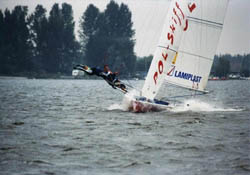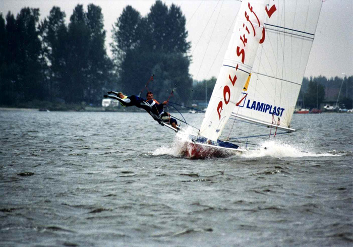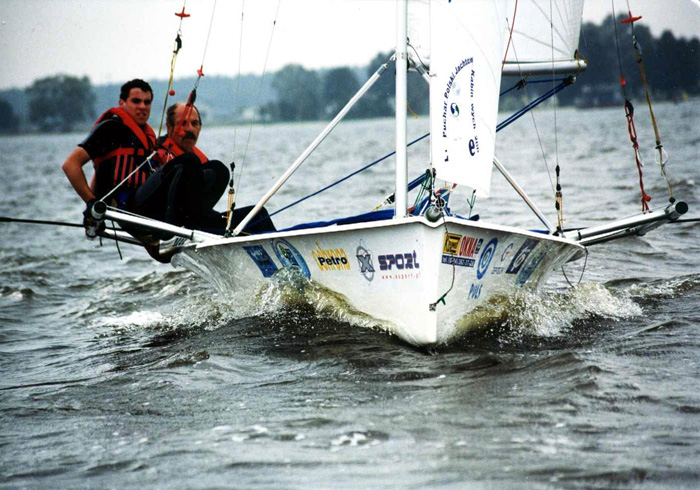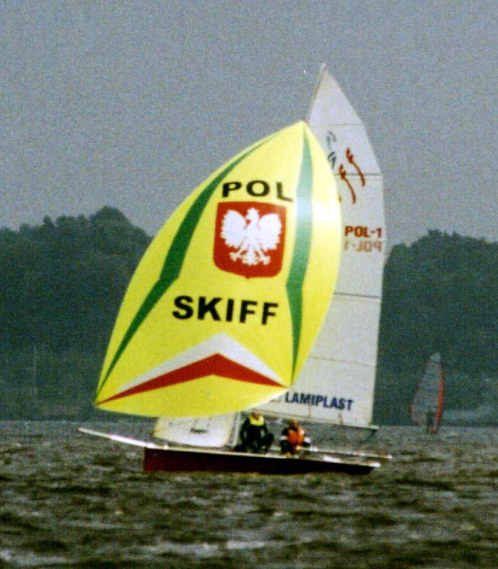 Konstruktor: Leszek Gonciarz Kraków ul. Szlak 38/3 Wszystkich zainteresowanych ściganiem się na takiej łódce prosimy o kontakt tel. lub e-mail ![]() Na targach "Wiatr i Woda" 2001r. Skiff odniósł swój drugi sukces (pierwszym było to , że powstał). Nagroda miesięcznika "Żagle" imienia Jerzego Fijki "Gwóźdź Targów" zamknęła kolejny etap w naszych pracach na rzecz animacji tej klasy jachtów w Polsce. Łódka wzbudziła ogromne zainteresowanie publiczności. Nie tylko "ścigantów", ale co zadziwiające także starszych ludzi. Media również zauważyły tę nowość. Siedem niezależnych stacji TV pokazało jacht w swoich relacjach z targów. Udzieliliśmy wielu wywiadów. Prawdę mówiąc nikt nie spodziewał się aż takiego zainteresowania. Wszyscy pytali kiedy będzie można zobaczyć łódź w akcji. Mamy nadzieję , że na regatach o "Puchar Standard Lamiplast Cup" rozgrywanych tradycyjnie w maju (w tym roku 19-20 maja) , LG 499 wystartują już jako klasa POL-Skiff, wszystkich zainteresowanych zapraszamy. Jeżeli pogoda pozwoli każdy będzie mógł spróbować swoich sił na tej niezwykłej łódce. Zarząd Warszawskiego Towarzystwa Regatowego zaprosił nas do udziału w całym cyklu swoich regat. A więc do zobaczenia na wodzie. Pierwsze Pływania Zwycięski powrót Jacka czyli powstanie nowej monotypowej klasy regatowej . Oczywiście piszę o Jacku Winnickim najlepszym żeglarzu klasy 560. Klasy która została zniszczona za skutek wypracowania przez niego tak wielkiej przewagi, że podjęcie z nim równorzędnej walki dla pozostałych startujących stało się niemożliwe. Przewaga ta wynikała z jego techniki żeglowania, umiejętnego doboru załóg i co najważniejsze optymalnego doboru łódki oraz dobremu przygotowaniu jej do sezonu. Była to wspaniała łódka regatowa ( istnieje ona dalej ale nie ma dla niej klasy ), która bardzo łatwo wchodziła w ślizg, pod spinakerem chodziła tak samo ostro jak Sympathy pod genakerem. Pływanie tą łódką szybką i łatwą w prowadzeniu dostarczało sternikowi i załodze niesamowitej satysfakcji - łatwo ją było pokochać. Po zmianie podziału na klasy i zniszczeniu klasy 560, { do starty w klasie Micro dopuszczono starsze jachty nie spełniające przepisów tej klasy ( maszt, ożaglowanie, stateczność ) które mniej traciły do Micro niż do Jacka } musiał odpowiedzieć sobie na pytanie co dalej? Czy "wykastrować" łódkę dla dostosowania jej do klasy 560 i mieć się na czym ścigać czy próbować tworzyć coś nowego ale dającego nie mniejszą satysfakcję z żeglowania i koniecznie monotypowego dla max. ograniczenia wyścigu zbrojeń. Mniej więcej w tym czasie zaprzyjaźniona i super sympatyczna rodzina Koteckich ("Cztery Koty") zaczęła mówić o przewagach skiffów australijskich. Po Warszawie krążyła kaseta pokazująca "uroki" żeglowania na skifie podnosząc poziom adrenaliny u zapaleńców. Jacek zdecydował, że musi to być łódź możliwie najprostsza i najtańsza dla dwuosobowej załogi. (Jak jest z wykwalifikowanymi i zapalonymi załogami wszyscy wiedzą. Na skifie tyle samo zależy od załoganta co i od sternika i obaj mają fantastyczną zabawę). W wyniku szeregu działań Jacka powstała konstrukcja Leszka Gonciarza wykonana przez Lamiplast z żaglami uszytymi przez Stanisława Sawko, która została przez Jacka opływana w dniu 21 października na Zalewie Zegrzyńskim, wystawiona z powodzeniem na targach "Wiatr i woda", opisana w "Żaglach"Nr1 i "Rejsie"Nr2 z których ten ostatni jest patronem medialnym. W czasie październikowych pływań pomimo braku wprawy załogi, przy sile wiatru w podmuchach 2B, wychodziła w ślizg przy baksztagach i bajdewindzie zmuszając załogę do wyjścia na wysięgniki. To była ekscytująca zabawa pomimo wywrotki. Wywrotka nastąpiła w trzeciej godzinie pływań czyli łódka jest cierpliwa i wyrozumiała. Jak to wyglądało możecie obejrzeć na załączonych zdjęciach. Pływanie na POL-SKIFF LG 499 dostarcza niesamowitych i niezapomnianych wrażeń. Premiera skiffa w regatach W dniach 9-10-06 odbyły się wreszcie pierwsze regaty na skiffie LG-499.Ponieważ przyjęła się nazwa POL-Skiff (choć jest to nazwa całego przedsięwzięcia) pozostańmy przy niej. Bazą regat był nowy port MPR-Yacht w Białobrzegach. Impreza organizowana i prowadzona konkursowo przez Zbyszka Kanię i jego współpracowników wzbudziła moją niekłamaną zazdrość. Zakończenie regat przeprowadzono sprawnie i PUNKTUALNIE mimo konieczności rozpatrzenia protestów. Nic w tym dziwnego bo skład Komisji Regat był także znakomity. Nagrody też były naprawdę fajne. POL-Skiff-ów wystartowało trzy a do tego jeden prawdziwy skiff australijski, niestety 14-sto stopowy aż z Bielska. Jego załoga pływa na nim już trzy lata i jej przewaga w opanowaniu łódki jest olbrzymia (na razie!). Na szczęście regaty odbyły się przy słabych wiatrach więc uniknęliśmy kompromitacji, ale nie pokazaliśmy na co stać Skiffa. Przy lekkich powiewach pływa on jak zwykła mała i szeroka łódka. Dopiero przy wietrze 2-3 B. zaczyna się szaleństwo ślizgów. Wyścigi były zażarte, bo chyba pierwszy raz w naszych regatach jachty były identyczne i o wynikach decydowała taktyka oraz sprawność załóg. Nie mniej premiera się odbyła i to samo w sobie jest już jakimś sukcesem. Jestem też mile zaskoczony ciepłym przyjęciem tej bardzo jednak ekstremalnej konstrukcji przez sędziów, organizatorów i większość zawodników. Mam też nadzieję ,że w następnych regatach które organizowane będą przez Hotel-500 w Zegrzu popłyniemy nieco sprawniej. Sądząc po licznych zapytaniach o koszt łódki, mamy nadzieję , że niedługo już po naszych wodach pływać będzie pokaźna flotylla tych jachtów. Długodystansowe Mistrzostwa Polski Płock 2001 Pogoda w tym sezonie nie rozpieszcza żeglarzy. Na Zalewie Włocławskim w sobotę do godziny 12 nie wiało, nic a potem led